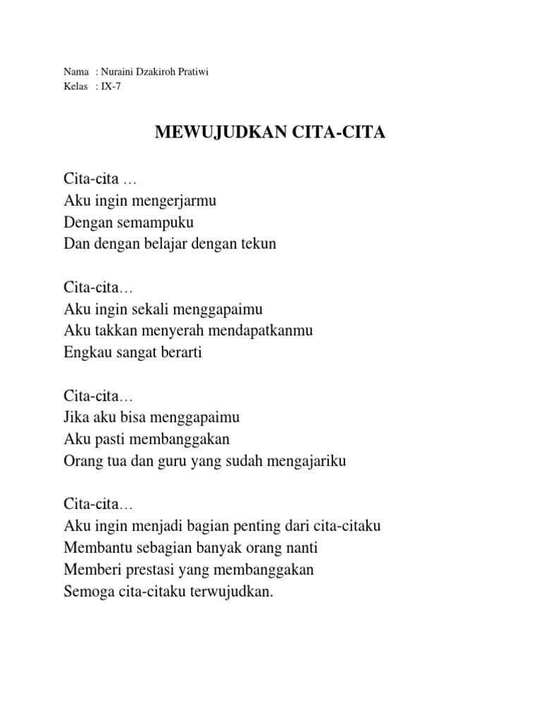 Maybe you would like to learn more about one of these? Puisi tentang cita citaku menjadi guru. Check spelling or type a new query. We did not find results for: